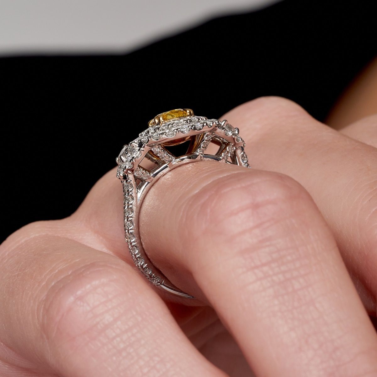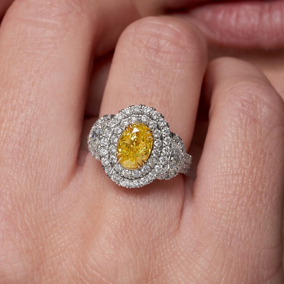 Fancy Vivid Yellow Oval Shaped Half Moon Pave Double-Halo Ring